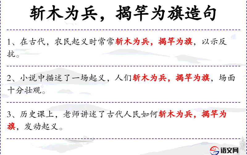 句子中的“斩木为兵”和“揭竿为旗”都是古代战争中的常见做法,反映了古代战争的原始性和临时性。这些表达也体现了古代战争文化的一部分。