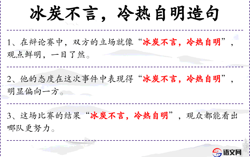 - 冰炭不言,冷热自明:成语,意思是事物本身的状态不言而喻,通过外在表现就能清楚地看出。