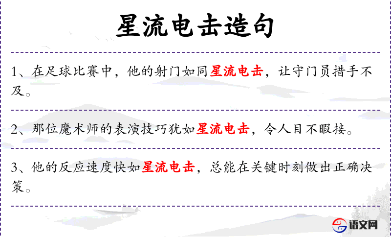 - 星流电击:这个成语比喻事物发展迅速,常见于文学作品中,用来形容速度极快的事物。
