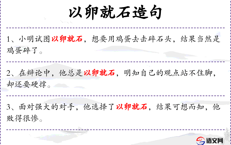 - 以卵就石:这个成语源自**古代,比喻力量悬殊的对抗,强调不自量力的行为。