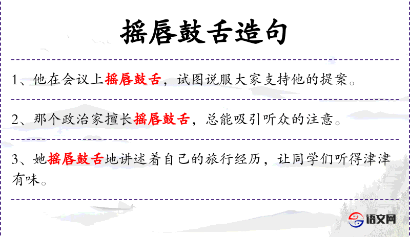 - 成语:“摇唇鼓舌”是一个汉语成语,源自古代,形容人说话能力强,能言善辩。