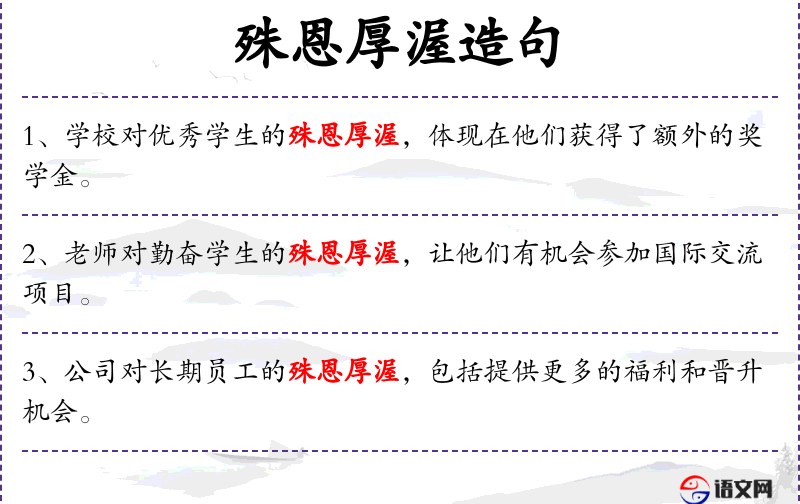 6. 【殊恩厚渥】 殊:特殊;渥:优厚。指恩惠优厚。