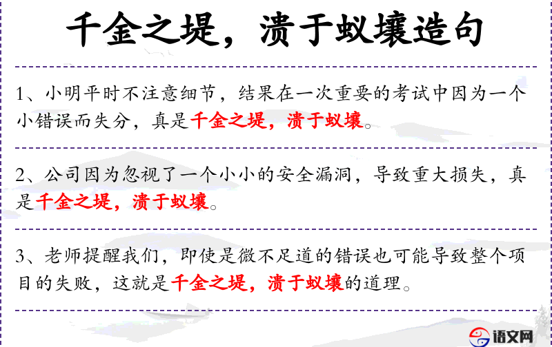 - 小明因平时忽视细节,在关键考试中因微小失误丢分,这正是“千金之堤,溃于蚁壤”的写照。