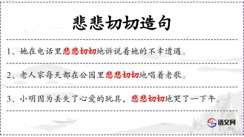 - 悲悲切切:形容非常悲伤的样子。