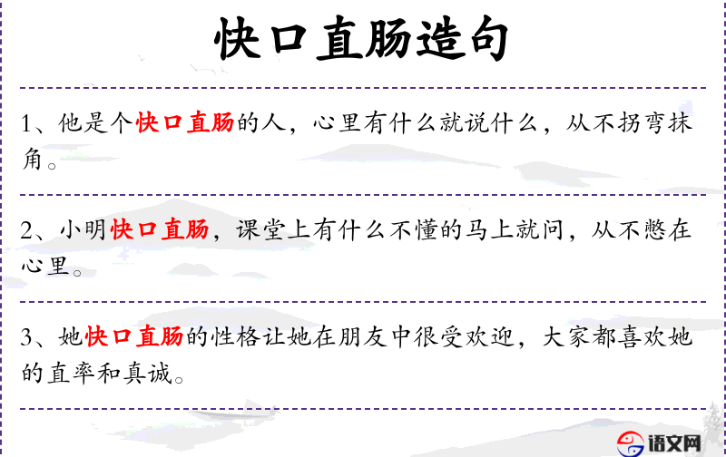 - 快口直肠:形容词短语,形容一个人说话直率,不拐弯抹角。
