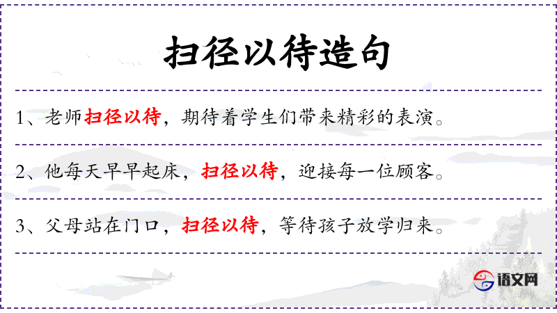 - 谓语:“扫径以待”是谓语,描述了主语的动作状态,表示老师在等待。