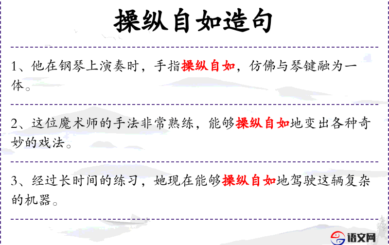 - 操纵自如:动词短语,表示控制得非常熟练和自然。