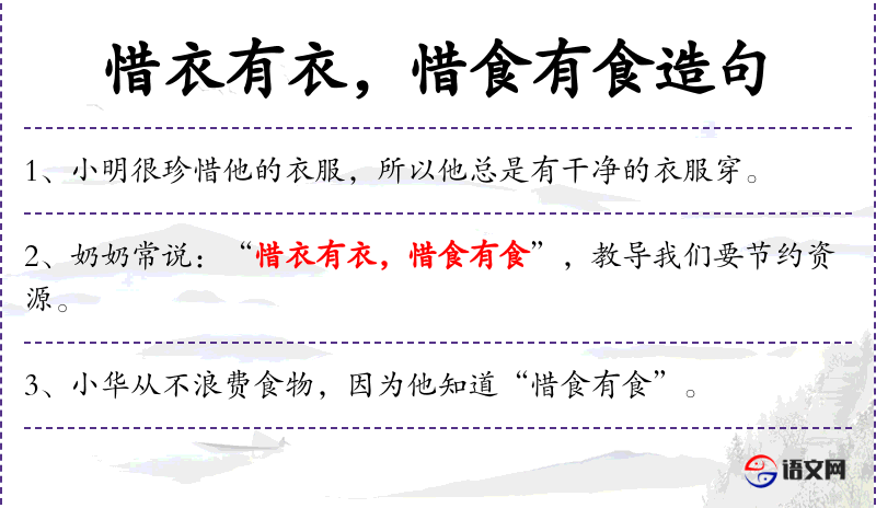 - 惜衣有衣,惜食有食:这句话的意思是,珍惜衣物就会有衣物穿,珍惜食物就会有食物吃。这里的“惜”表示珍惜、节约。