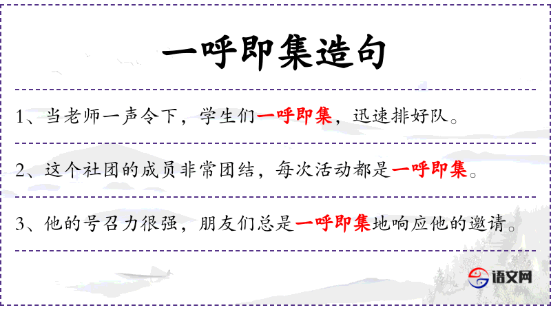 1. 【一呼即集】 - 呼:呼唤;集:聚集。呼唤一声,人们就聚集到一起。