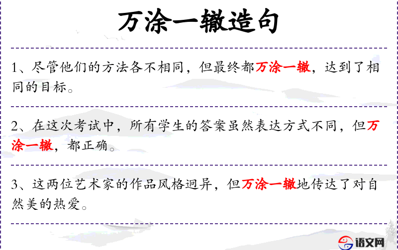 - 万涂一辙:这个成语反映了中华文化中对于形式与实质关系的理解,即形式可以多样,但核心意义不变。
