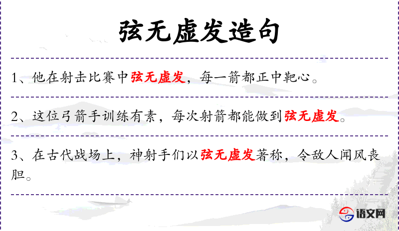 - 以弦无虚发著称:形容射箭技术非常高超,每箭必中。