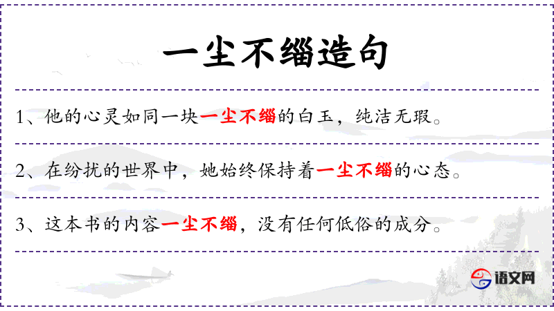 1. 【一尘不缁】 - 犹一尘不染。泛指丝毫不受坏习惯,坏风气的影响。也用来形容非常清洁、干净。