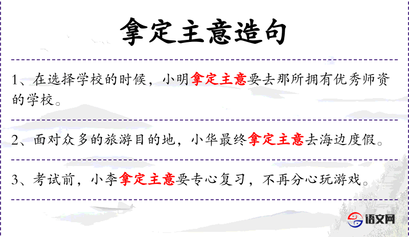 - 拿定主意:固定搭配,表示做出决定。