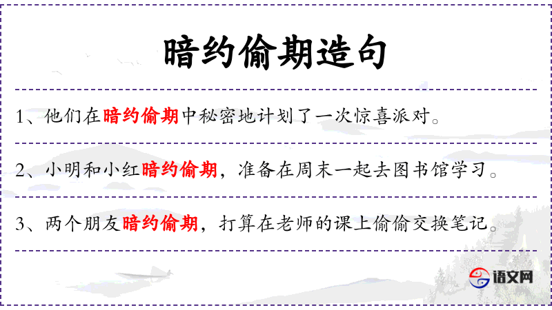 3. 【暗约偷期】 - 暗地里私自定约。指男女间相爱或勾搭。