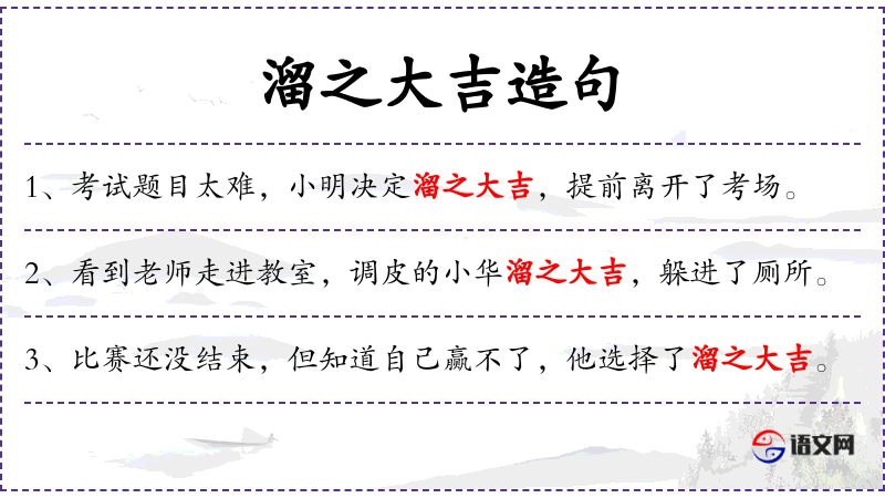 1. 【溜之大吉】 溜:趁人看不见走开;吉:吉祥。偷偷地跑掉为妙。