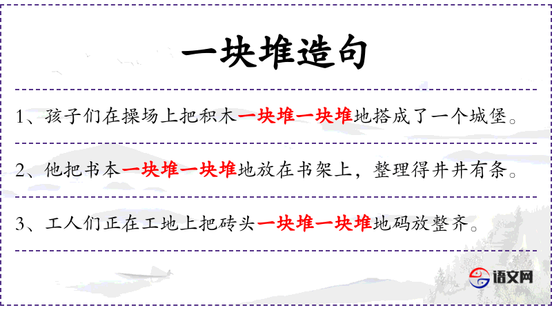 5. 【积木】 - 儿童玩具,是一套大小和形状不相同的木块或塑料块,大多是彩色的,可以用来摆成多种形式的建筑物等的模型。