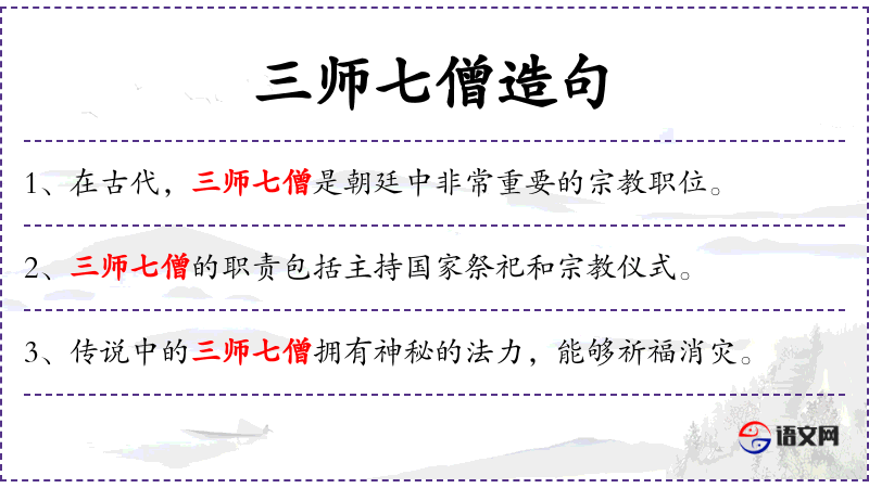 1. 【三师七僧】 佛教语。佛徒授比丘具足戒,行三师七僧之制。三师指戒和尚﹑羯磨师和教授师。七僧指七名作证的和尚。也称为"三师七证"。参阅《四分律删繁补阙行事钞》卷上之三。