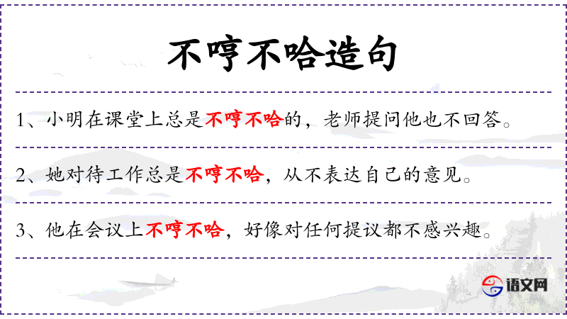 句子:“小明在课堂上总是不哼不哈的,老师提问他也不回答。”