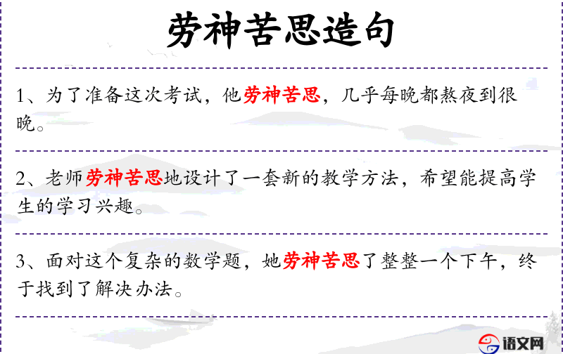 - 劳神苦思:成语,形容费尽心思。