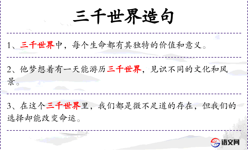 1. 【三千世界】 - 佛教用语,指包括“三”种“千”数的大千世界。后泛指处处,即全世界的意思。