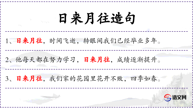 - “日来月往”这个成语强调时间的流逝,常用于描述长期的努力和积累。