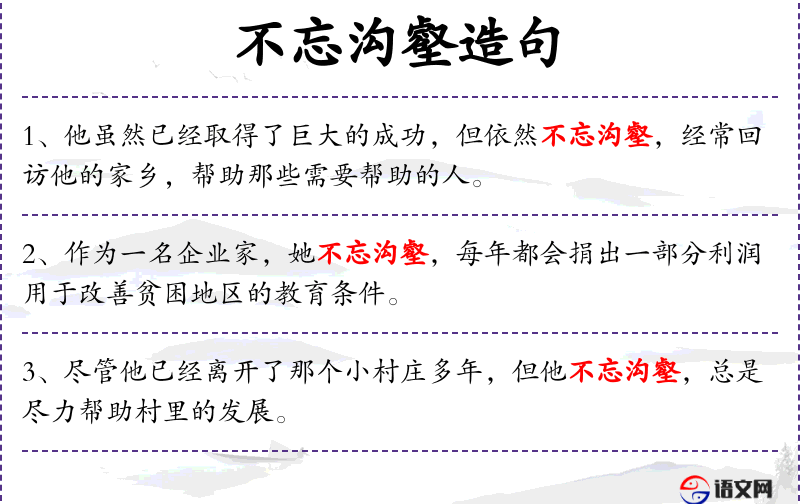 1. 【不忘沟壑】 沟壑:山沟。念念不忘为正义而死,弃尸山沟。形容有为正义献身的思想准备。也比喻人发迹之后不忘过去贫贱的日子。
