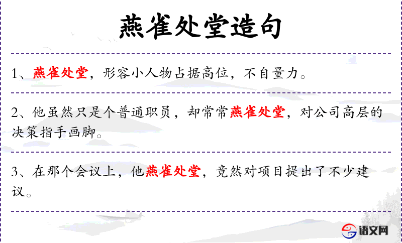 5. 【燕雀处堂】 处:居住;堂:堂屋。燕雀住在堂上。比喻生活安定而失去警惕性。也比喻大祸临头而自己不知道。