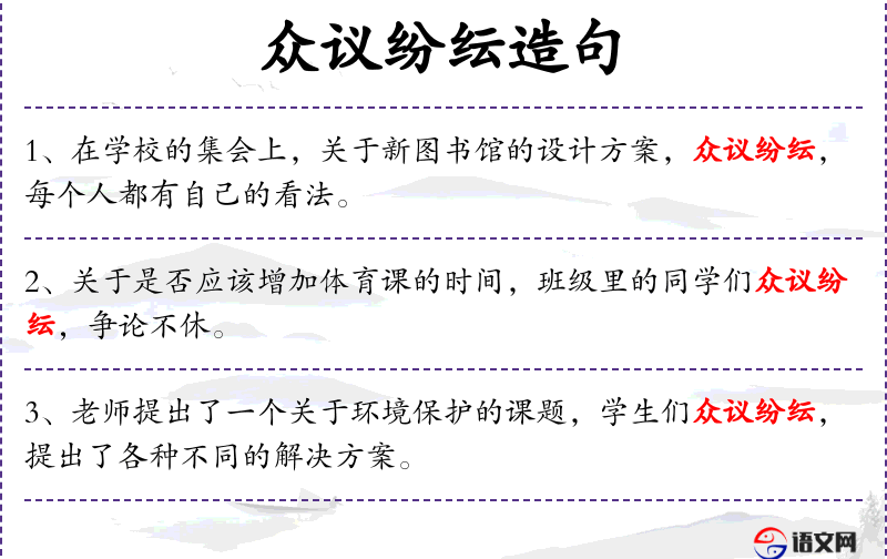 句子:“在历史课上,同学们对古代战争的胜负原因众议纷纭,讨论热烈。”