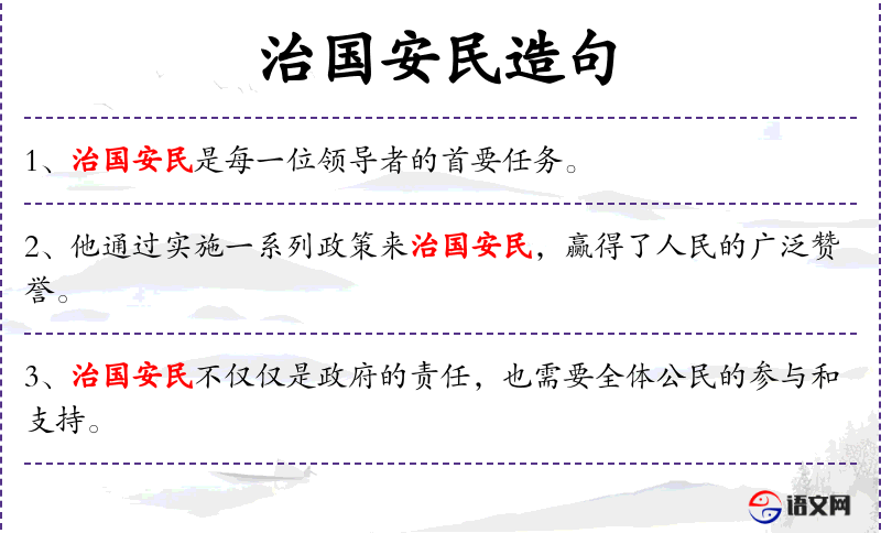 1. 【治国安民】 治:治理;安:安定。治理国家,安定人民。