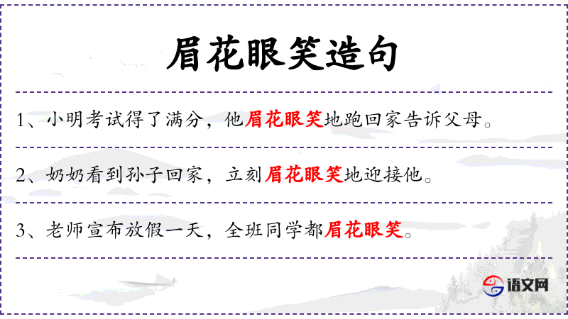 3. 【眉花眼笑】 - 形容非常高兴、兴奋的样子。