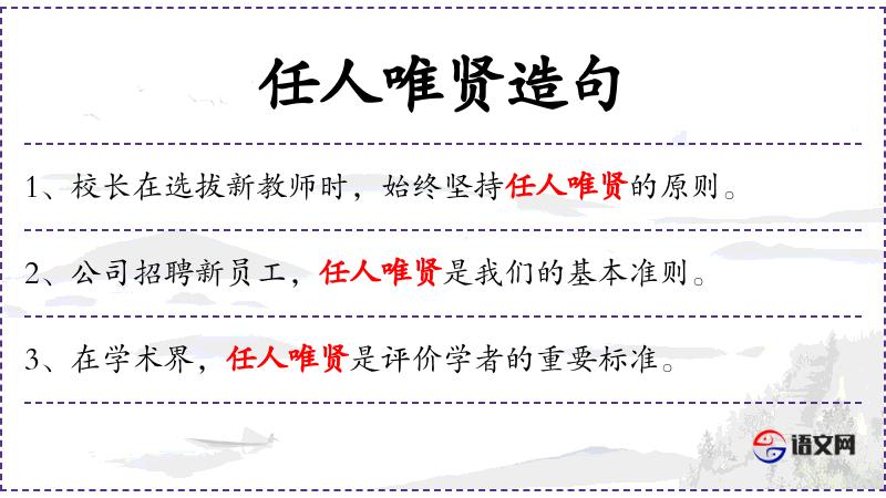 - 任人唯贤:指选拔人才只看重其才能和品德,不考虑其他因素。