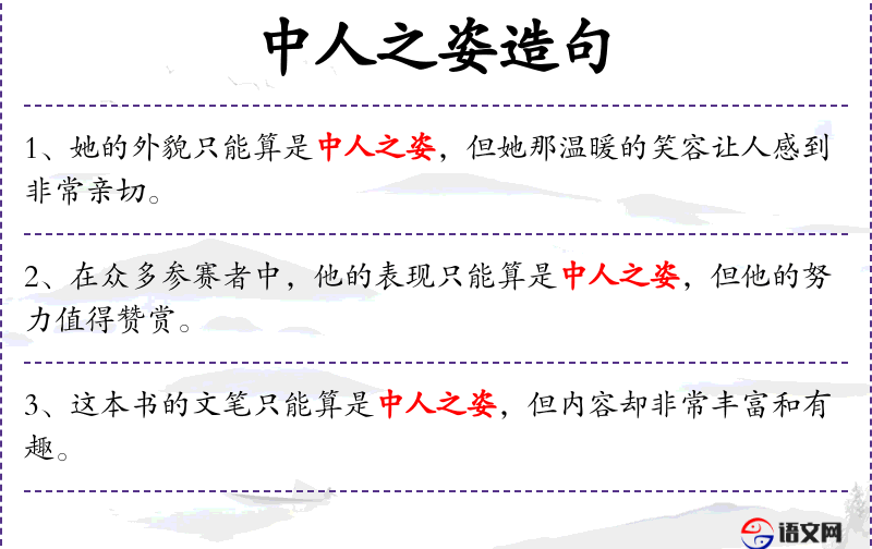- 中人之姿:这个表达体现了中文中对中等水平的委婉表达方式。
