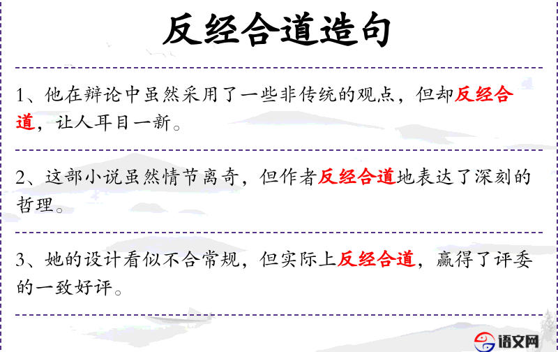 - 反经合道:表面上违背常规,实际上符合道理或真理。