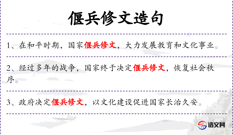 - 偃兵修文:成语,意为停止军事行动,转而注重文化和教育的发展。