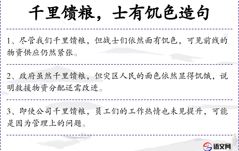 - 尽管我们努力从远方运送粮食,但前线的战士们依然面露饥色,可见物资供应仍然不足。