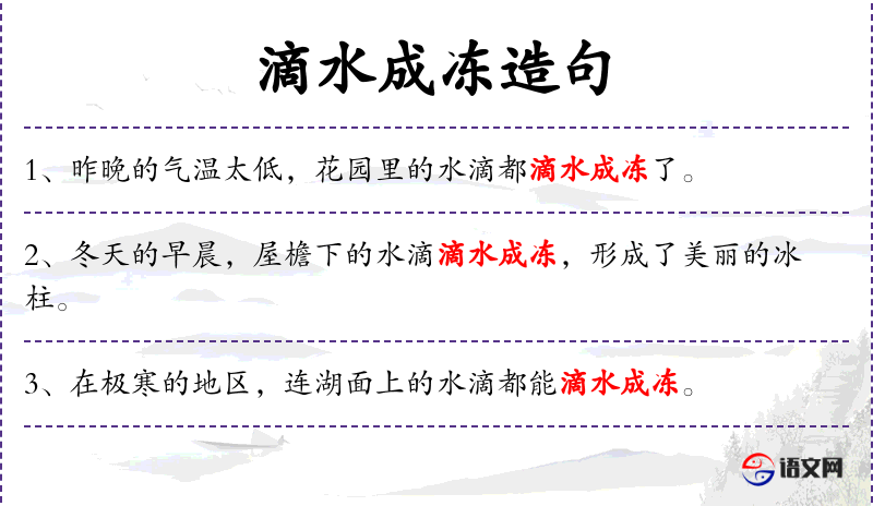 3. 【滴水成冻】 - 滴:液体一点点落下;冻:凝结成冰。水滴下去就结成冰。形容天气十分寒冷。
