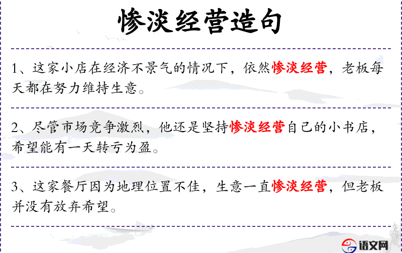 - 惨淡:形容词,形容生意不景气。 *. 经营:动词,指管理或运营。
