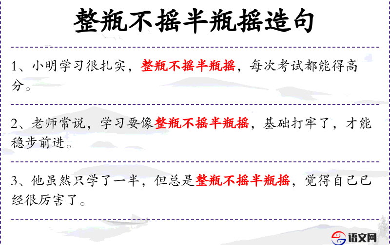- 文化意义:“整瓶不摇半瓶摇”是传统文化中的一个成语,反映了人对谦虚和自大的态度。