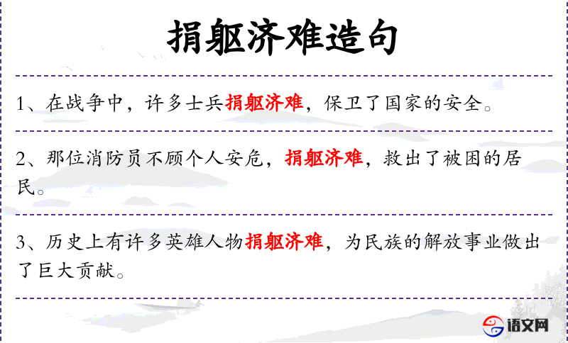 - 捐躯济难:动词短语,意为牺牲生命以帮助他人或国家。