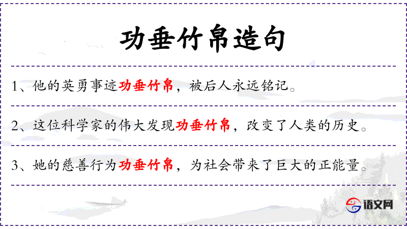 1. 【功垂竹帛】 垂:流传;竹帛:古代写字用的竹简和白绢,借指典籍史册。建立伟大功勋,名载青史。