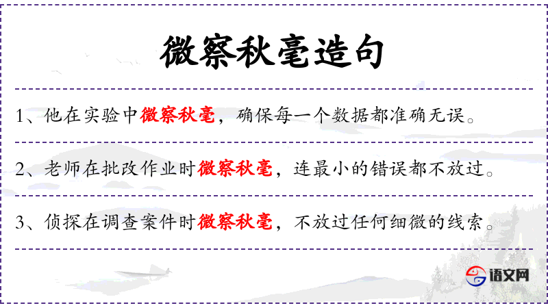 - 微察秋毫:比喻观察非常细致,不放过任何细微之处。