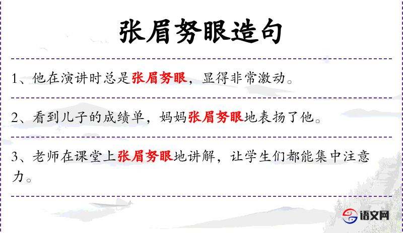 - 张眉努眼:成语,形容人表情紧张或专注。