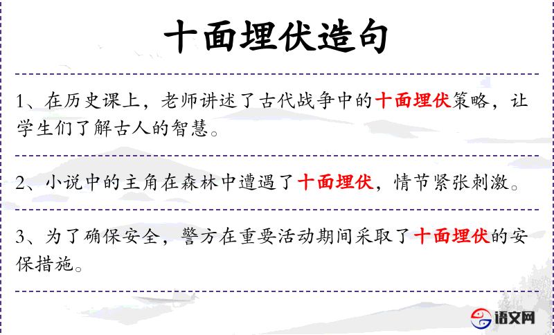 “十面埋伏”源自**古代的军事策略,意味着从多个方向进行埋伏,增加敌人的不确定性和压力。这个成语也常用于比喻复杂的局面或策略。