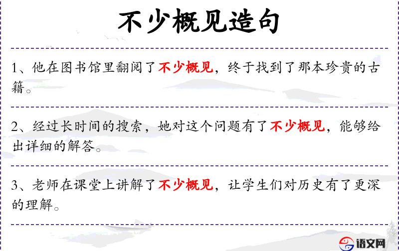 1. 【不少概见】 概:梗概,大略。所能见到的只是一个梗概。指很难真正见到。