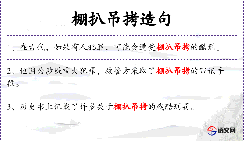 1. 【棚扒吊拷】 扒:脱掉;吊:悬挂;拷:拷打。把人绳绑吊起,剥去衣服严刑拷打。