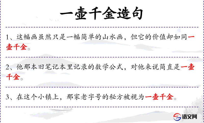 - 一壶千金:这个表达可能源自“一壶酒值千金”,比喻某物的价值极高,常用于文学作品中。