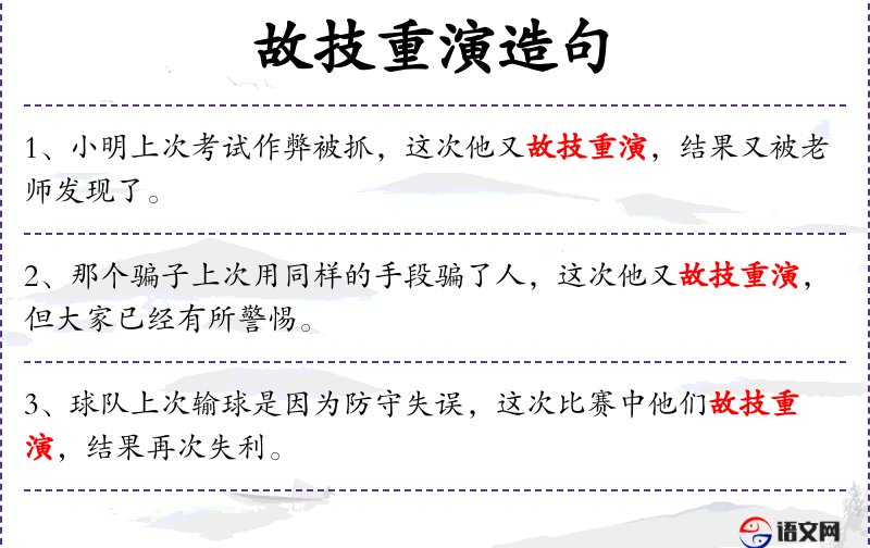 1. 【故技重演】 技:同“伎”,花招。老花招或老手法再耍一次