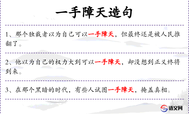 句子中的“一手障天”可能源自**传统文化中的成语或典故,比喻某人试图用不正当手段掩盖真相或控制局面。这反映了文化中对权力和控制的批判态度。