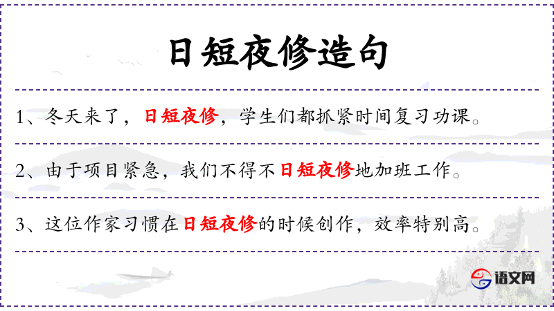 句子中的“日短夜修地”反映了中文文化中对勤奋和不懈努力的重视。这种表达方式在中文中常见,用来形容某人非常努力。