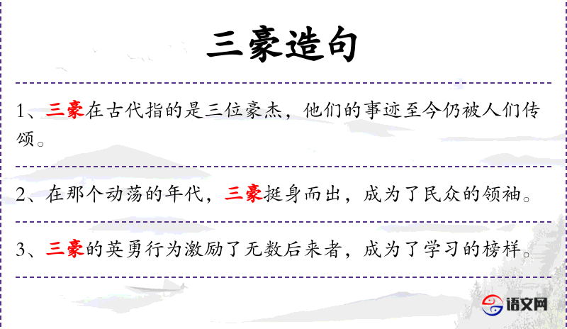 1. 【三豪】 指宋欧阳修﹑石延年﹑杜默三人。宋石介作《三豪诗送杜默师雄》,谓欧阳修为文豪,石延年为诗豪,杜默为歌豪。诗云"曼卿豪于诗,社坛高数层。永叔豪于辞,举世絶俦朋。师雄歌亦豪,三人宜同称。"
